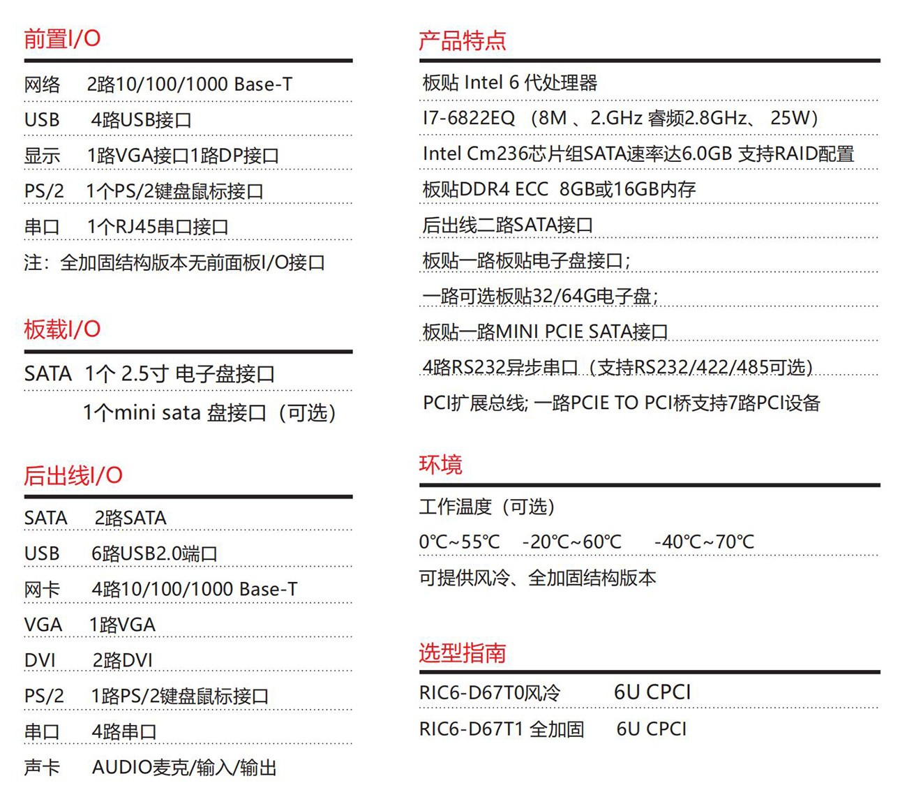 采用Intel? 六代处理器设计方案,CompactPCI 6U 架构 符合 PICMG2.0 R3.0、PICMG2.16、PICMG2.3标准和海军标主板标准。具备丰富的外围接口;设计了高效的散热系统,可显著提高处理器的浮点运算性能,以太网、PCIe to PCI扩展总线, 满足视频采集与处理、雷达和声呐等应用对高速数据传输的要求。专为恶劣环境使用而设计,满足无人机、装甲车、水面舰 艇等军工领域。