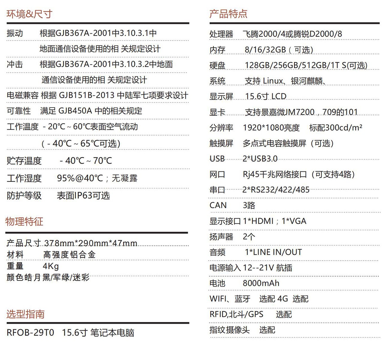 采用国产飞腾处理器FTD2000/8+ZX-200芯片组按国产 100%设计,具备丰富的外围接口;设计了高效的散热系统, 可显著提高处理器的浮点运算性能,广泛应用于军事、野外操 作、工业领域的服务和操作、网络的通讯和测试、高速公路收费等 领域。适合国防、公安、消防、交通、石油、勘探、船舶、煤炭等 行业。