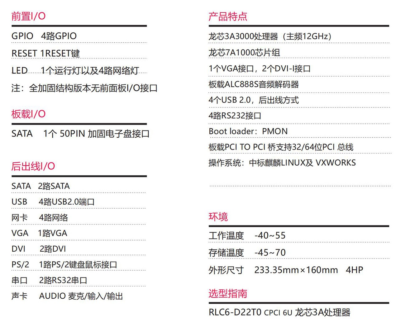 采 用 国 产 龙 芯 处 理 器 设 计 方 案 , CompactPCI 6U架 构 , 符 合 PICMG2.0 R3.0、PICMG2.16、PICMG2.3标准和海军标主板标准。该产品具备优越的数据处理能力、图形显示能力、网络通讯能 力、雷达和声呐等应用对高速数据传输的要求。专为恶劣环境使用而设计,适用于对实时数据处理、通讯、自动化、军工等领域。