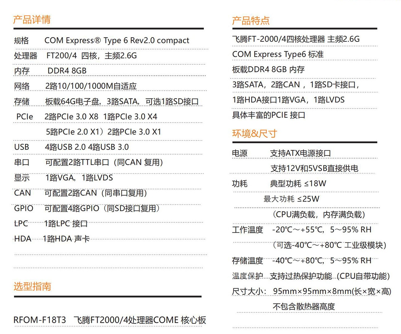 采用FT-2000/4高性能处理器设计 符合COM Express Type6 rev2.0 接口规范设计,板载DDR4 8GB 内存, 64G工业固态电子盘,支持VGA和LVDS双屏显示输出, 是一款国产自主可控集高性能,低功耗,高可靠性于一体的高集成度COME 核心板,可广泛应用于能源,軌交,国防,科研,通讯等领域。