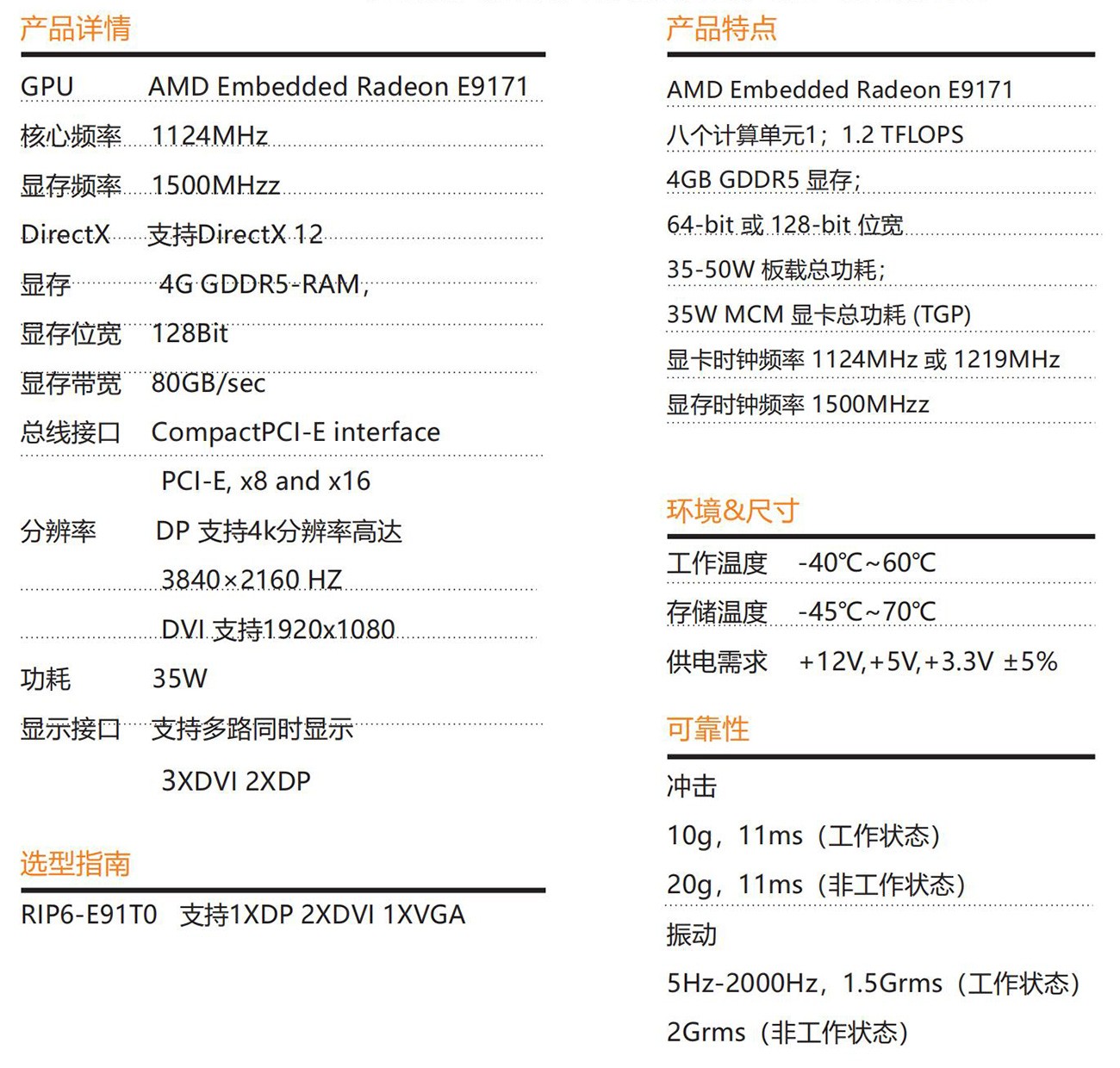 一 款 CPCI-E发 烧 级 独 立 显 卡 , 采 用 AMD Embedded Radeon E9171图 形 芯 片 , 14nm FinFET 北 极 星 架 构 八 个 计 算 单 元1;1.2 TFLOPS 4GB GDDR5 显存;64-bit 或 128-bit 位宽35W板载总功 耗 ; (TGP)显 卡 时 钟 频 率 1124MHz 或 1219MHz显 存 时 钟 频 率 1500MHzzAMD 宽域 (Eyefinity) 技术支持多达五个显示输出24K