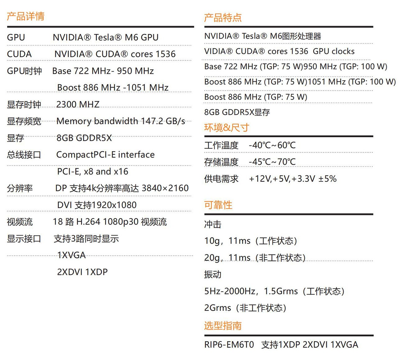 一款CPCI-E发烧级独立显卡,采用NVIDIA? Tesla? M6 图形加速器 芯 片 设 计 , NVIDIA? Tesla? M6 GPU Memory clock 2300 MHz为 256Bit 8GB GDDR5显 存 ; 具 有 出 色 多 显 示 输 出 接 口 、 NVIDIA? Tesla? M6 GPU 加速器针对刀片式服务器进行了优化,能 为数据中心的虚拟工作站、桌面和应用程序提供高性能图形。该加速器 与 NVIDIA GRID? 软件无缝地配合工作 ,可使企业虚拟化包括专业图形 应用程序在内的众多应用程序,并将这些应用程序传输到设备中,该产品有良好计算和图形性能。