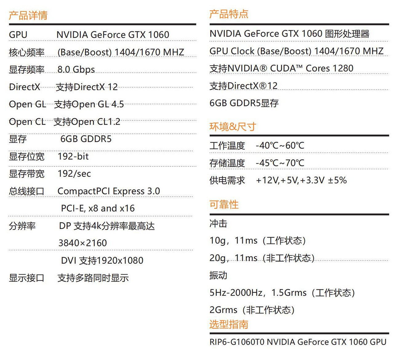 一款CPCI-E独立显卡,采用NVIDIA GeForce GTX 1060图形芯片, 显存时钟为8.0 GBPS为192Bit 6G GDDR5显存 支持Open GL 4.5支持 DirectX 12支持Open CL 1.2支持NVIDIA? CUDA? Cores 1280 等技术;具有出色多显示输出接口、该产品有良好计算和图形性能,适合高性能的应用场合,这使得显示??槟芄挥Χ宰罡丛拥牟⑿杏τ贸绦?,比如地形 绘图雷达导航和气象绘图,面部和手势识别,以及生物识别分析等。