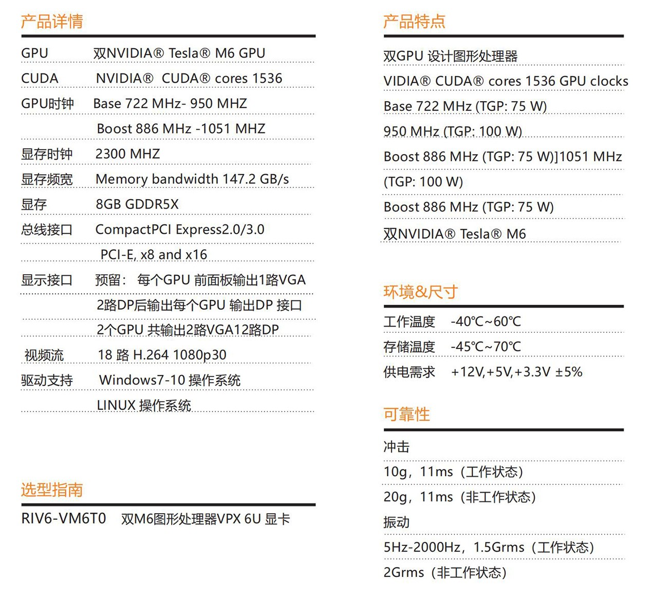 一款高性能双GPU VPX结构独立显卡,采用二个NVIDIA? Tesla?M6 图 形 加 速 器 芯 片 设 计 , NVIDIA? Tesla? M6 GPU Memory clock 2300 MHz为256BiT8GB GDDR5显存 ;具有出色多显示输出接口、NVIDIA? Tesla? M6 GPU 加 速器针对刀片式服务器进行了优化,能为数据中心的虚拟工作站、桌 面和应用程序提供高性能图形。该加速器与 NVIDIA GRID? 软件 无缝地配合工作 ,可使企业虚拟化包括专业图形应用程序在内的众多 应用程序,并将这些应用程序传输到设备中,该产品有良好计算和图 形性