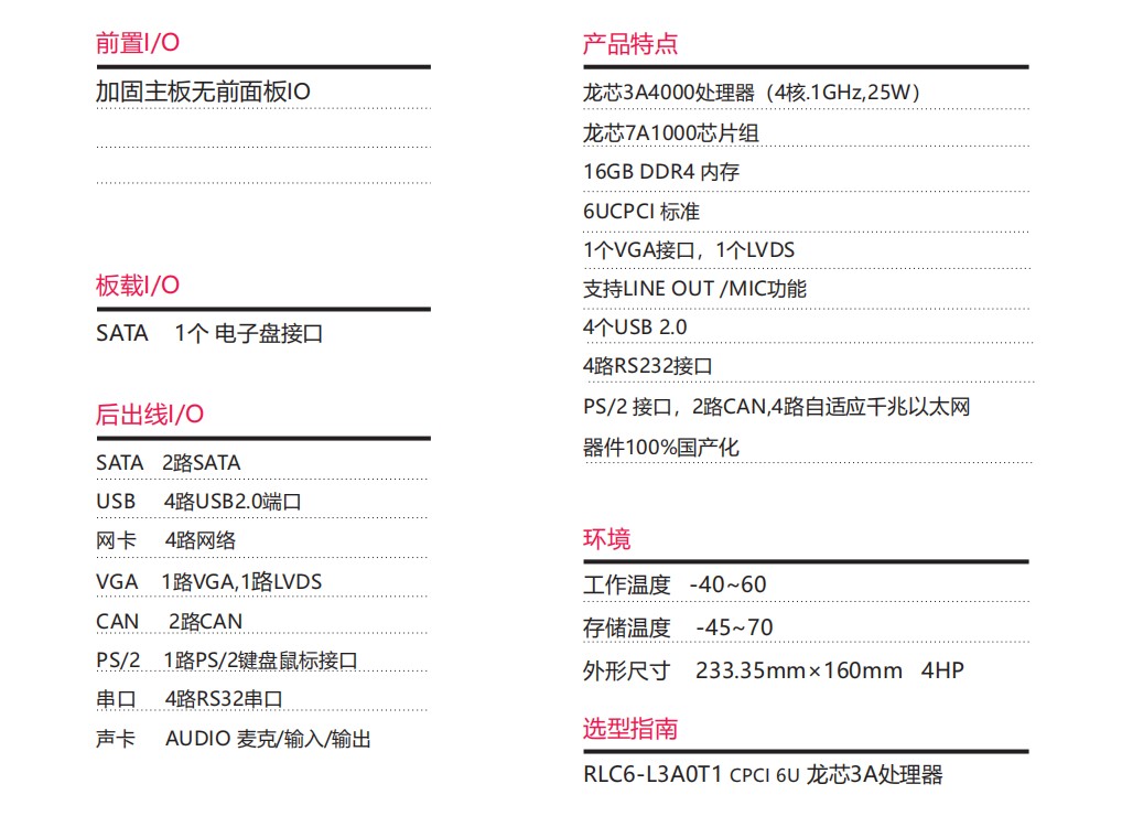 采用国产龙芯3A4000+7A1000处理器设计,CompactPCI 6U架 构,符合PICMG2.0 R3.0、PICMG2.16、PICMG2.3标准和海军标 主板标准。该产品具备优越的数据处理能力、图形显示能力、网络 通讯能力、雷达和声呐等应用对高速数据传输的要求。专为恶劣环 境使用而设计,适用于对实时数据处理、通讯、自动化、军工等领 域。