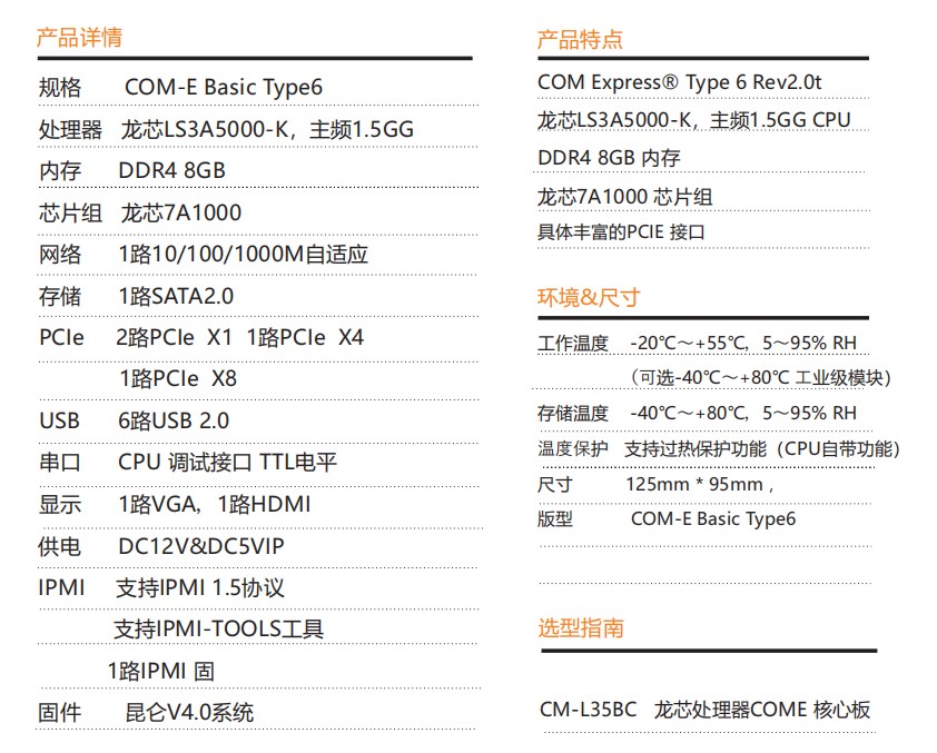 核心板采用龙芯3A5000CPU搭配龙芯7A1000桥设计COM- E Basic Type6版 型,板载 DDR4 8GB 内存支持VGA,HDMI双屏显示输出,是一款 国产自主可控集高性能,低功耗,高可靠性于一体的高集成度COME核心板,可广泛应用于能源等领域。